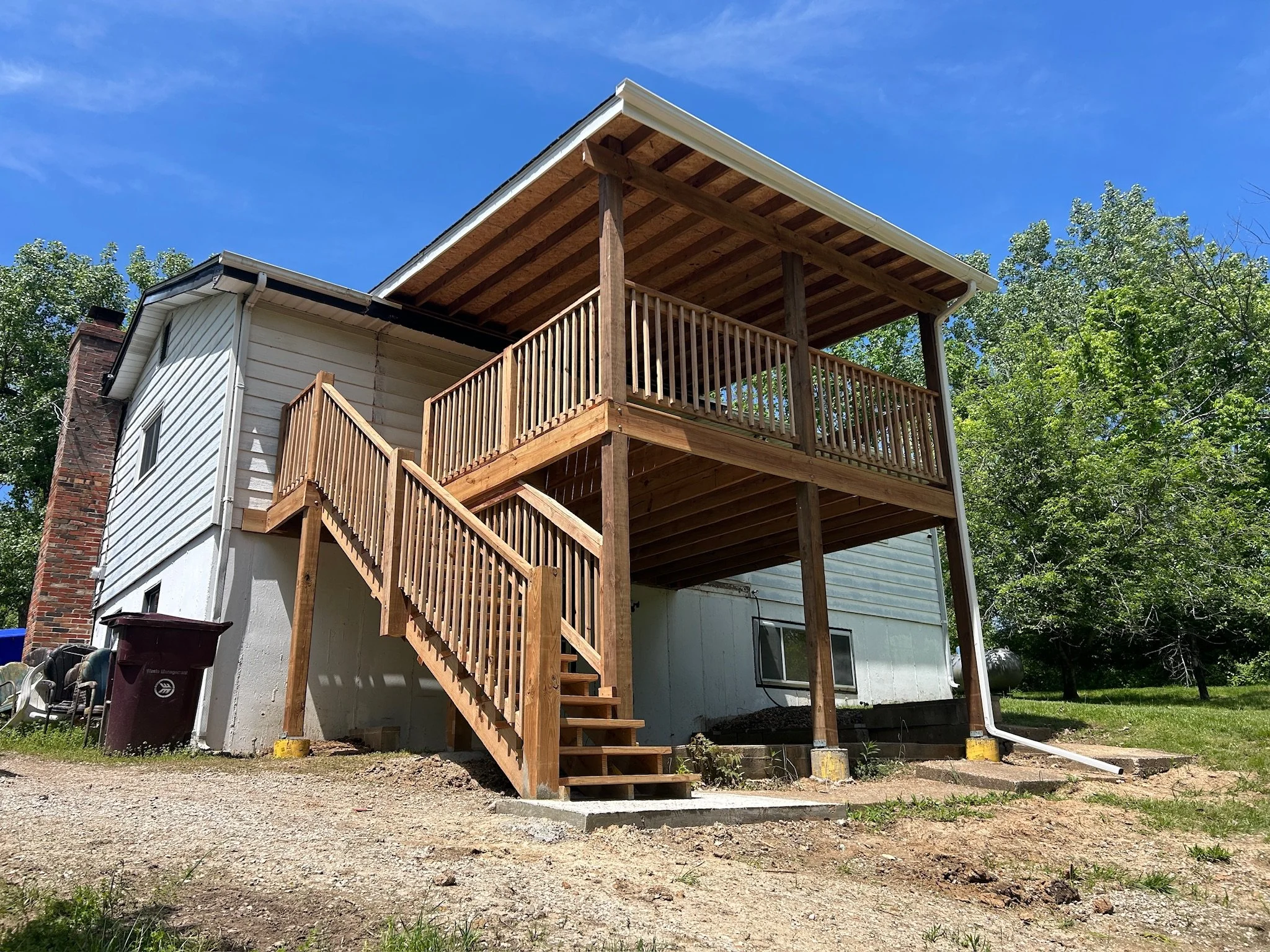 This upgrade was for another repeat client. Their home needed a new deck that matched the scale and beauty of its surroundings. We designed and built an expansive deck that stretches from the basement level to the roofline. Sturdy cedar-toned 6×6” posts create a bold, architectural presence while overlooking several acres of scenic land. The homeowner can now enjoy peaceful days from the covered upper deck or step out to the lower-level walkout—perfect for entertaining and taking in the views.